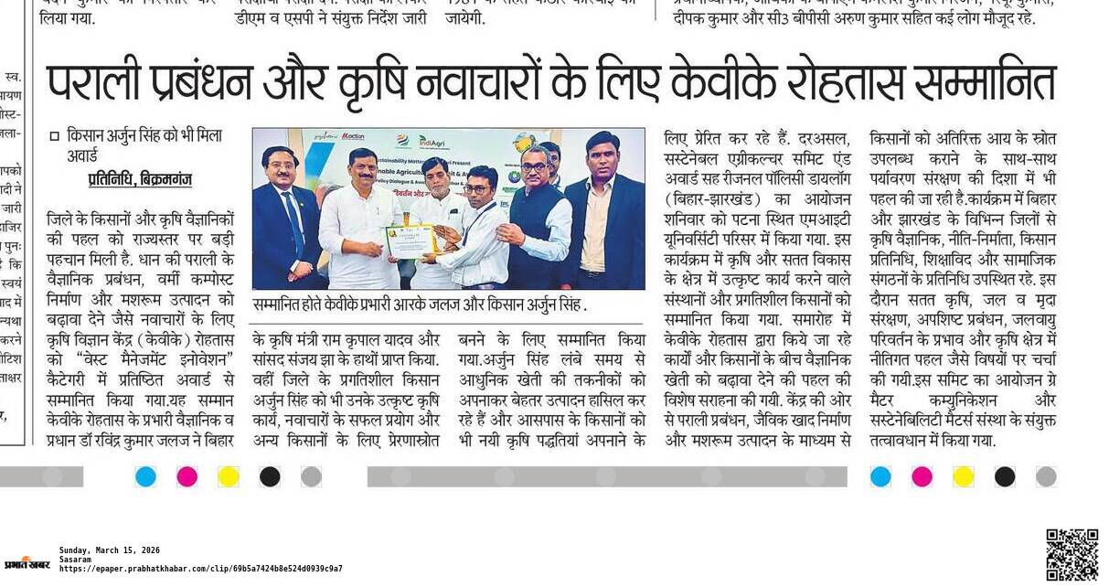 | 1 | KVK Rohtas bagged Waste Management Award 2026 during Sustainable Agriculture Summit & Regional Policy Dialogue (Bihar & Jharkhand) | KVK Rohtas bagged Waste Management Award 2026 during Sustainable Agriculture Summit & Regional Policy Dialogue (Bihar & Jharkhand) | 2026-03-15 |